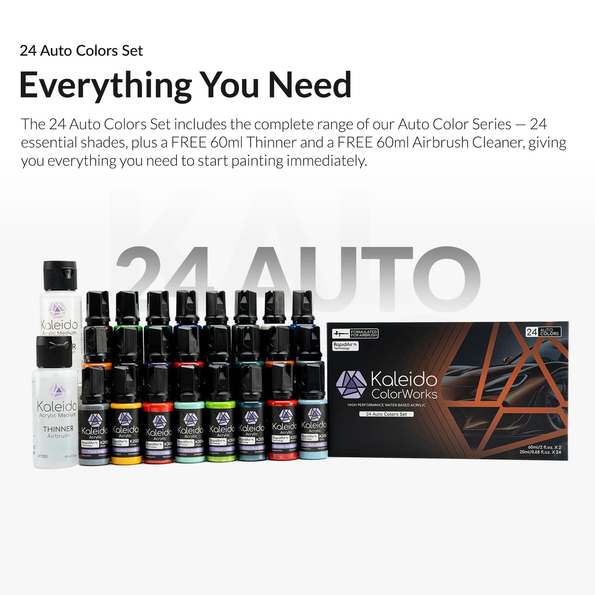 The 24 Auto Colors Set from the Kaleido ColorWorks series is a premium water-based acrylic paint collection designed for airbrush enthusiasts, model builders, and custom paint artists seeking authentic automotive finishes. Featuring 24 factory-inspired automotive shades — including high-gloss solids and dynamic pearlescent metallics — this curated set captures the look of real vehicle paintwork with stunning depth and reflectivity.