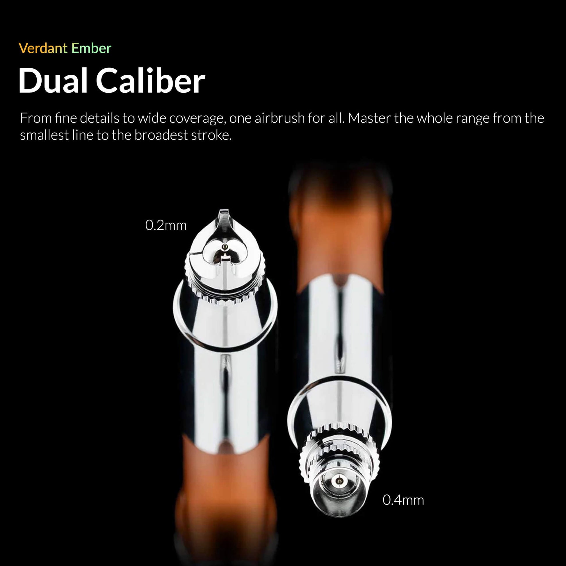 Dual-Caliber Versatility (0.2 mm & 0.4 mm): The included 0.2 mm nozzle enables ultra-fine detail work — perfect for shading, panel lining, weathering, and crisp highlights — while the 0.4 mm nozzle handles priming, base coats, and broader coverage with speed and consistency.