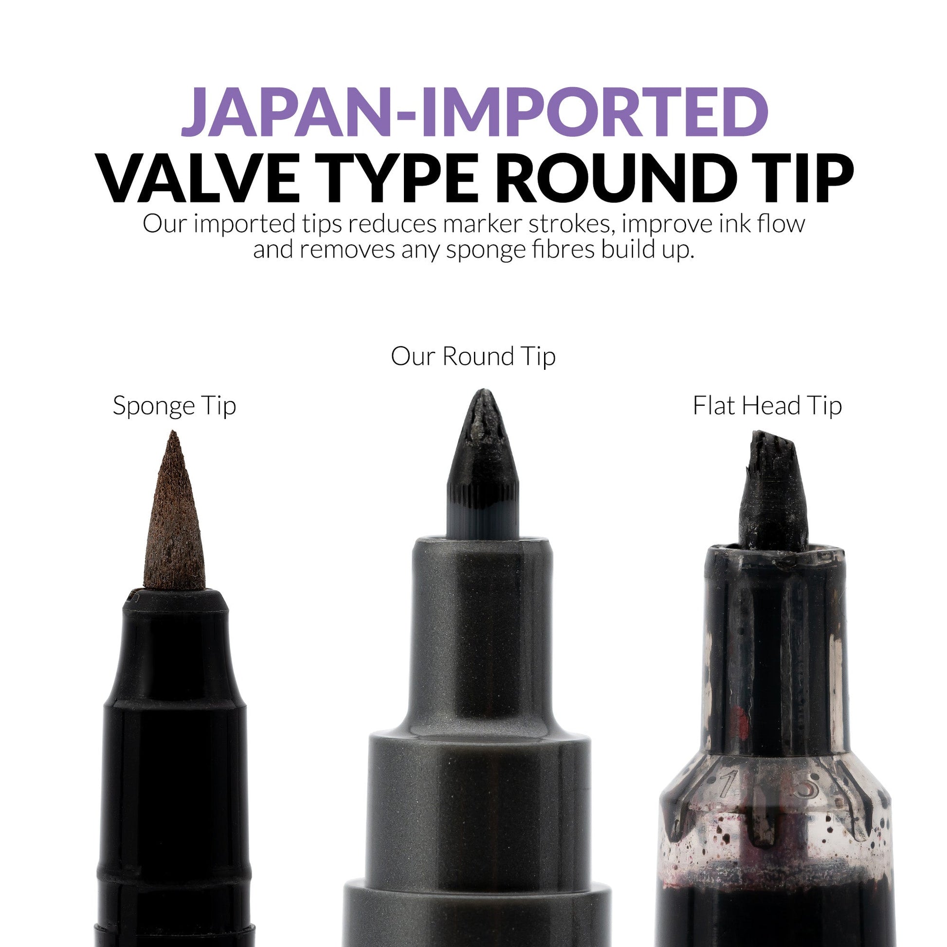 Japan-Imported Valve-Type Round Tips: Engineered for precision and smooth ink flow, preventing sponge fiber buildup and delivering flawless line control and coverage.