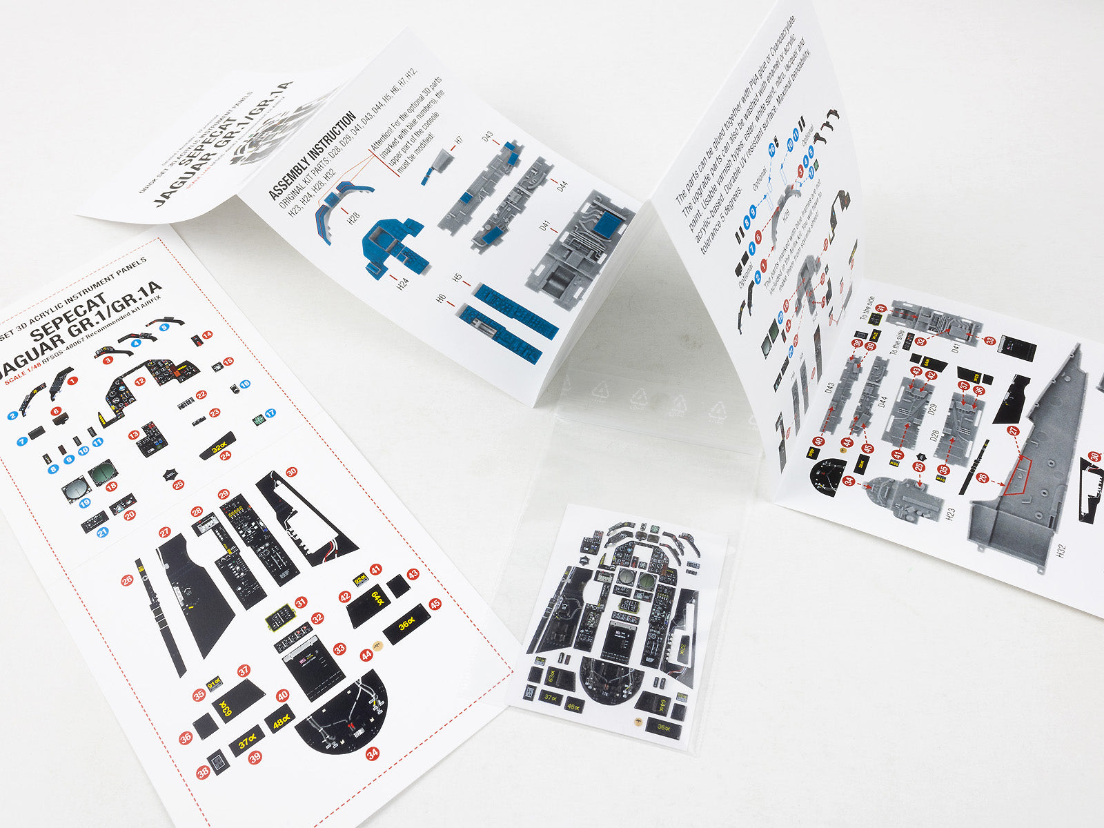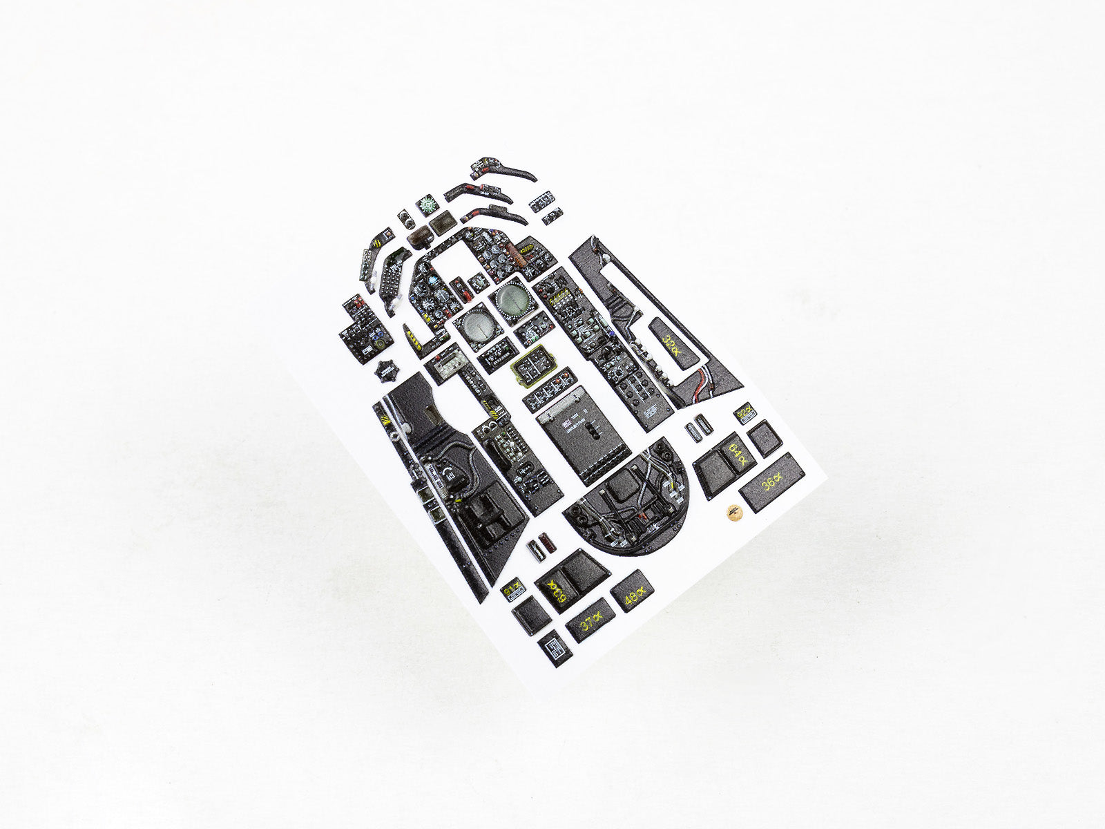 This high-resolution 3D-printed resin set faithfully reproduces the Jaguar’s complex instrument panel, strike-navigation displays, side consoles, and control surfaces. Each component is printed in vivid colour with sharp bezels, crisp dial faces, and realistic raised textures that elevate the cockpit far beyond standard kit detail.